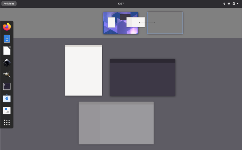 The first step in solving the problems is to move the workspaces to the top of the screen and present them horizontally. Now they are always in view of the user when he/she activates the Activities Overview. By presenting them horizontally it's easier to create a mental image of them.