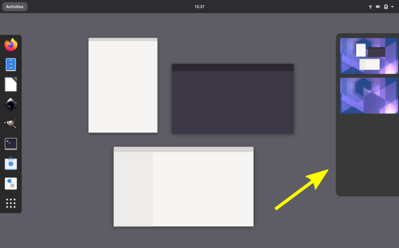 As I wrote in the introduction of the GNOME power settings, I visited the GNOME Shell hackfest in The Hague in October 2019. During that meeting I spoke with the UX designers of the GNOME desktop and I told them that I have a small annoyance with how the workspaces are presented: the Workspace Overview (the column at the right side in the mockup below) always shows one workspace more than there is in use.
